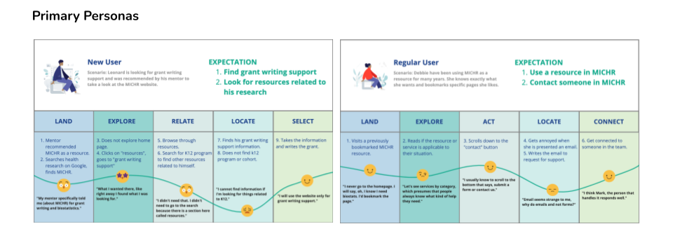 We created primary personas (New Users, Regular Users) and secondary personas (PIs/Mentors, MICHR Programs) to represent key user groups. Their shared needs included intuitive navigation, clear content organization, and quick access to information. User journey maps highlighted barriers and opportunities across their workflows.
