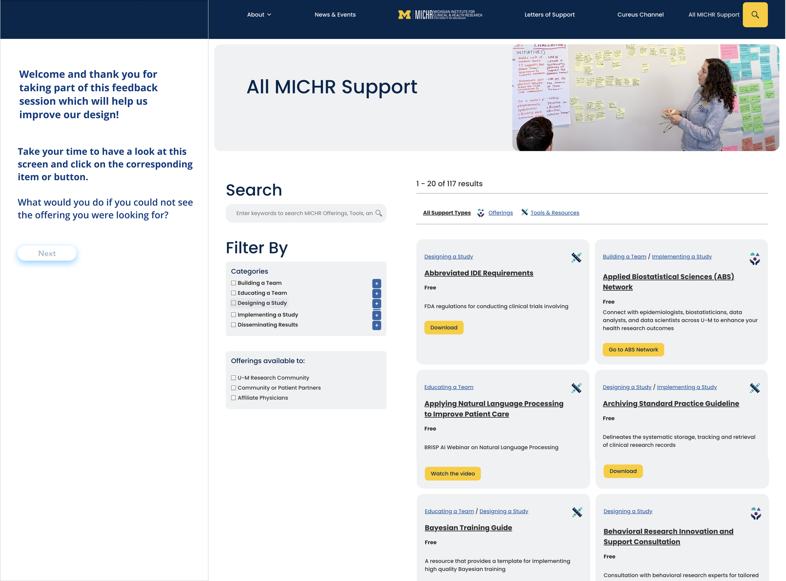 User testing with 17 participants including primary investigators, MICHR staff, community members, and patient partners, revealed unclear terminology, responsiveness issues across screen sizes, and areas for improved accessibility. Qualitative data synthesis also surfaced distinct needs across user groups, underscoring the importance of more tailored accommodations.