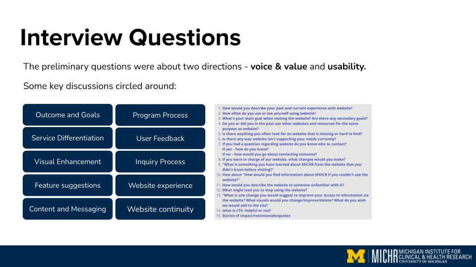 We conducted 20 empathy interviews: 3 with leadership, 12 with program users, and 5 with external users. Participants were recruited through internal MICHR programs and channels. Each 60-minute Zoom interview explored key aspects of the current website experience, including usability, navigation, clarity of educational content, visual expectations, and overall user perception.