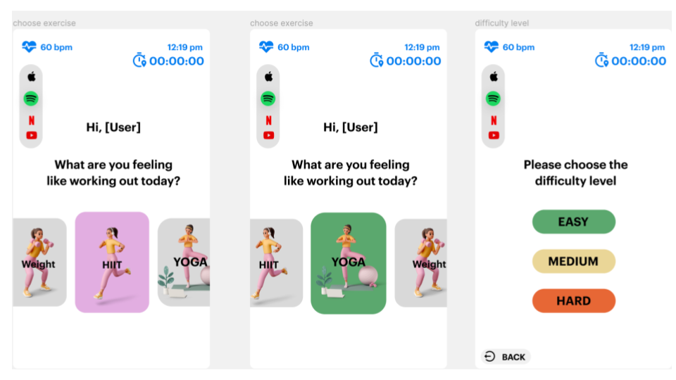 With the better scoped-down idea, primarily focussing on the posture-watch feature and accompaniment media during the exercise, the team created the mock-up of the product by projecting Figma animation onto the white wall and recruiting 5 participants to test the flow of the functionalities of our product.